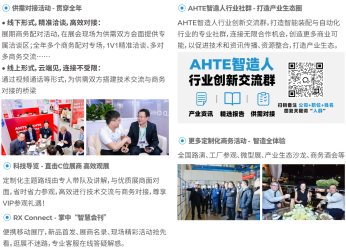 AHTE 2025將通過(guò)全新線上、線下、活動(dòng)、營(yíng)銷及定制化高效活動(dòng),提供一站式技術(shù)交流及商務(wù)對(duì)接全新聯(lián)接平臺(tái),讓觀眾能夠隨時(shí)、隨地了解工業(yè)自動(dòng)化生產(chǎn)裝配行業(yè)前沿技術(shù)趨勢(shì)、與行業(yè)領(lǐng)頭企業(yè)進(jìn)行全新聯(lián)接,推動(dòng)中國(guó)制造業(yè)發(fā)展,構(gòu)建產(chǎn)業(yè)生態(tài)圈。