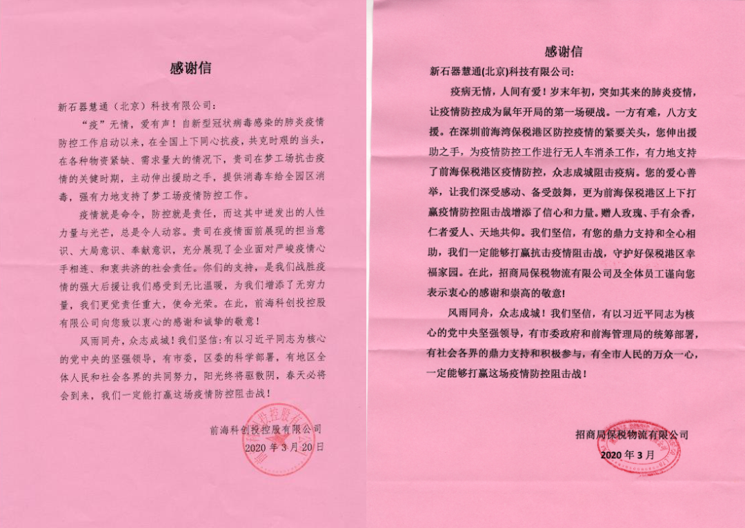 新冠肺炎疫情暴發(fā)以來,新石器AI無人車義無反顧扛起責(zé)任與擔(dān)當(dāng)。在深圳各地為政府及企業(yè)提供無人防疫服務(wù),消殺防疫、防疫宣傳,守護(hù)深圳人民的生命安全。在全國新冠肺炎疫情防控形勢持續(xù)向好,各地生產(chǎn)、生活秩序加快恢復(fù)的時刻,新石器收到深圳政府部門與企業(yè)發(fā)來感謝信。