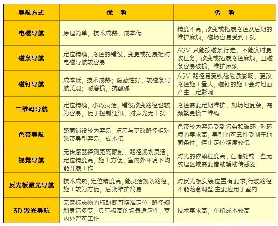 讓AGV精確地知道自身位置,是AGV的核心技術(shù)之一,發(fā)展至今數(shù)十載已衍生出多種導(dǎo)航方式,包括電磁導(dǎo)航、磁帶導(dǎo)航、磁釘導(dǎo)航、二維碼導(dǎo)航、色帶導(dǎo)航、視覺導(dǎo)航、反光板激光導(dǎo)航、3D激光導(dǎo)航等等,技術(shù)演變從最初的有軌導(dǎo)航到無軌導(dǎo)航,對(duì)特定標(biāo)志物的依賴逐漸減少,對(duì)環(huán)境的適應(yīng)性也在逐漸增強(qiáng)。