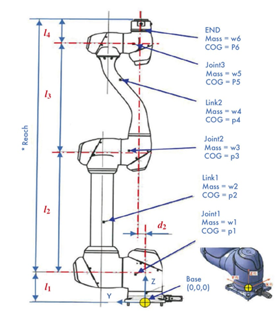 這些參數(shù)(圖 1)通常由協(xié)作機器人制造商提供,還包括關(guān)節(jié)和連桿質(zhì)量以及相對于基面坐標的重心位置的詳細信息。