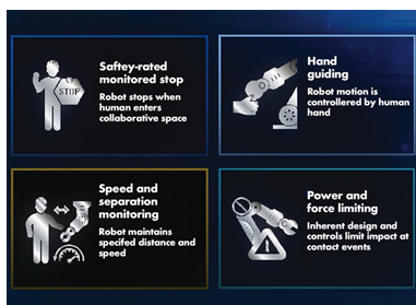 在選擇任何協(xié)作機器人時,安全性至關(guān)重要。由于協(xié)作機器人在共享空間中與人類協(xié)作,因此它們必須配備許多固有的安全功能。徹底的風(fēng)險評估對于確定特定的協(xié)作機器人設(shè)計是否滿足預(yù)期的安全需求至關(guān)重要。典型的安全功能包括基于集成到設(shè)計中的傳感器來防止過大的力、扭矩或速度的限制。安全運動配置由安全風(fēng)險評估的結(jié)果決定,該評估定義了與特定安全事件相關(guān)的停止模式。