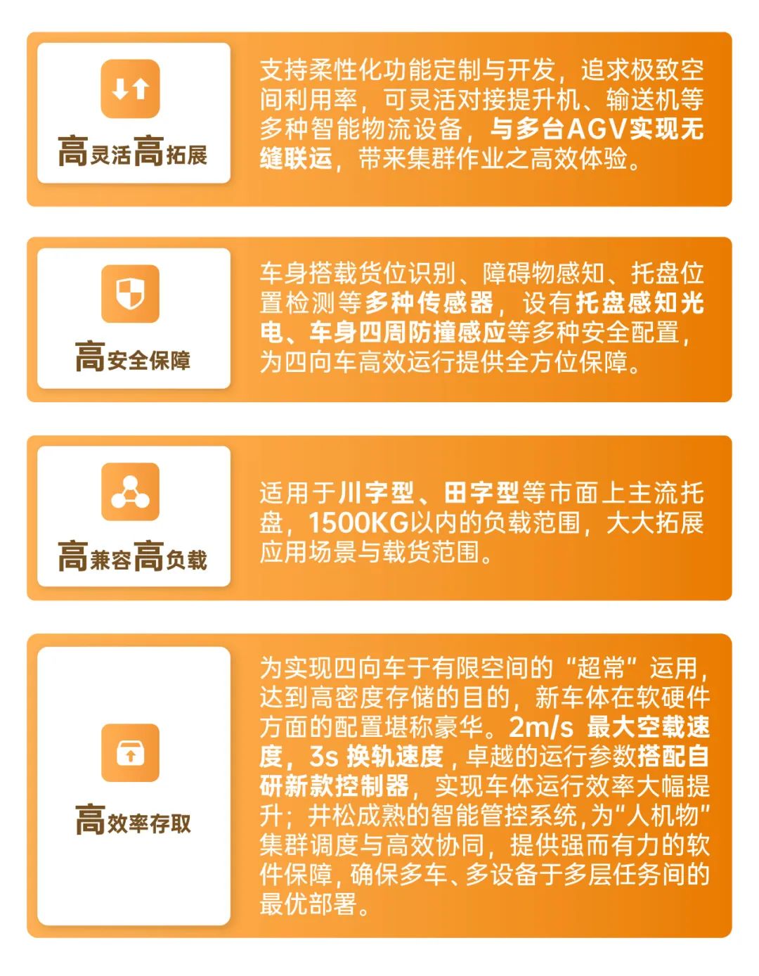 要解決上述問題,智能四向車立庫方案堪稱首選。該方案以托盤四向穿梭車為核心,通過智能物流技術(shù)與裝備,實(shí)現(xiàn)車體于貨架內(nèi)四向行駛和物料的高效存取,達(dá)到多場(chǎng)景靈活應(yīng)用、高密度存儲(chǔ)的目的。井松智能基于16載智能制造經(jīng)驗(yàn),提煉、總結(jié)大量軟硬件設(shè)備系統(tǒng)研制與應(yīng)用心得,重磅推出新一代四向穿梭車。