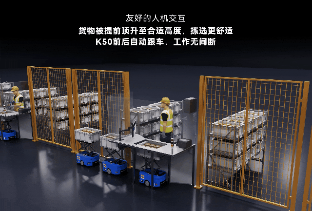 K50可根據(jù)工作站的揀選工人身高,自動調(diào)節(jié)舉升高度,在到達(dá)工作站前便以合適高度就位;為實(shí)現(xiàn)無間斷的連續(xù)揀選,K50搭載激光雷達(dá),擁有自動跟車自動排隊(duì)功能,全方位滿足企業(yè)對經(jīng)濟(jì)型、高效率、和人機(jī)工程的要求。