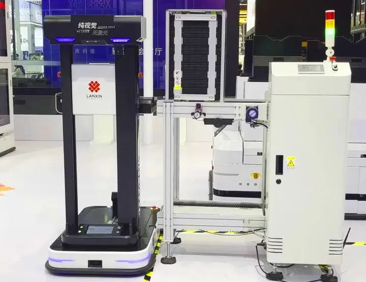 在智慧物流專區(qū),藍芯科技集中展示了公司經(jīng)典產(chǎn)品,如智能搬運機器人、花籃上下料機器人、涂布機上下料機器人、無人叉車,更帶來一款重磅新產(chǎn)品——純視覺SMT上下料機器人。