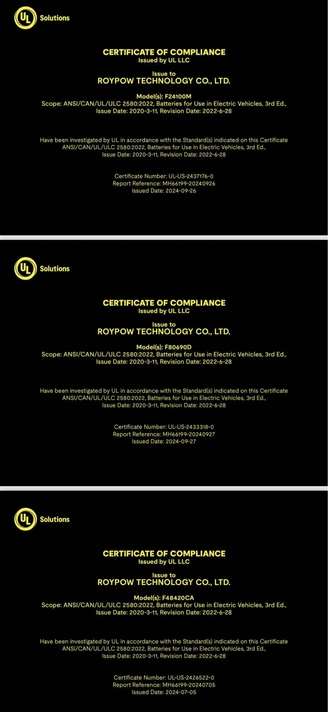 UL2580認(rèn)證標(biāo)準(zhǔn)是由全球權(quán)威的安全科學(xué)機構(gòu)UL Solutions制定的鋰離子電池安全標(biāo)準(zhǔn),專門針對應(yīng)用于電動汽車(包括電動叉車)中的動力電池。該標(biāo)準(zhǔn)涵蓋了電池系統(tǒng)在電氣性能、機械強度、環(huán)境適應(yīng)性等多方面的嚴(yán)格測試要求,確保電池在過充、短路、碰撞、振動、高低溫等極端工況下依然具備高度的安全性與穩(wěn)定性。通過這一認(rèn)證,意味著電池產(chǎn)品經(jīng)過了全面而嚴(yán)格的測試,符合法規(guī)要求和行業(yè)標(biāo)準(zhǔn)。