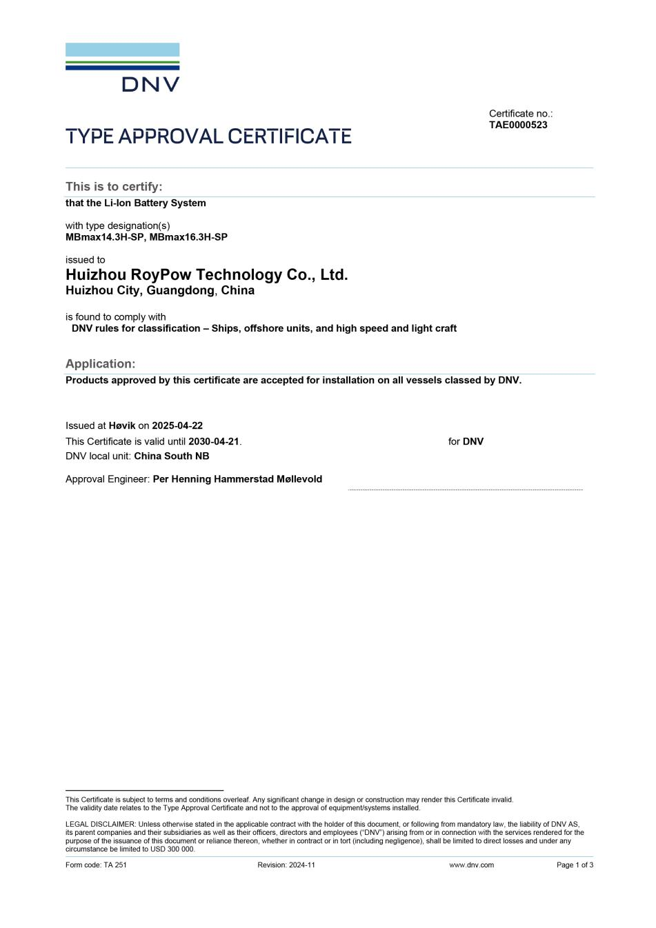 DNV挪威船級社成立于1864年,是全球領(lǐng)先的船級社和國際權(quán)威認(rèn)證機構(gòu)。DNV對樂億通船舶動力電池系統(tǒng)提出了最嚴(yán)苛認(rèn)證標(biāo)準(zhǔn),從系統(tǒng)結(jié)構(gòu)的設(shè)計要求、電氣安全、電池安全、環(huán)境適應(yīng)性、電磁兼容、功能安全、環(huán)保等方面進(jìn)行全方位的技術(shù)要求審核和嚴(yán)格測試,并完成了整體體系和生產(chǎn)質(zhì)量控制技術(shù)審核,最終通過并授予DNV認(rèn)證證書。