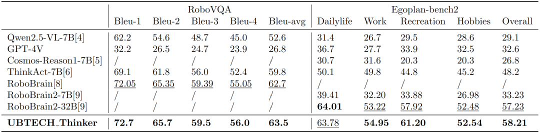 優(yōu)必選Thinker在RoboVQA與Egoplan-bench2中排名第一