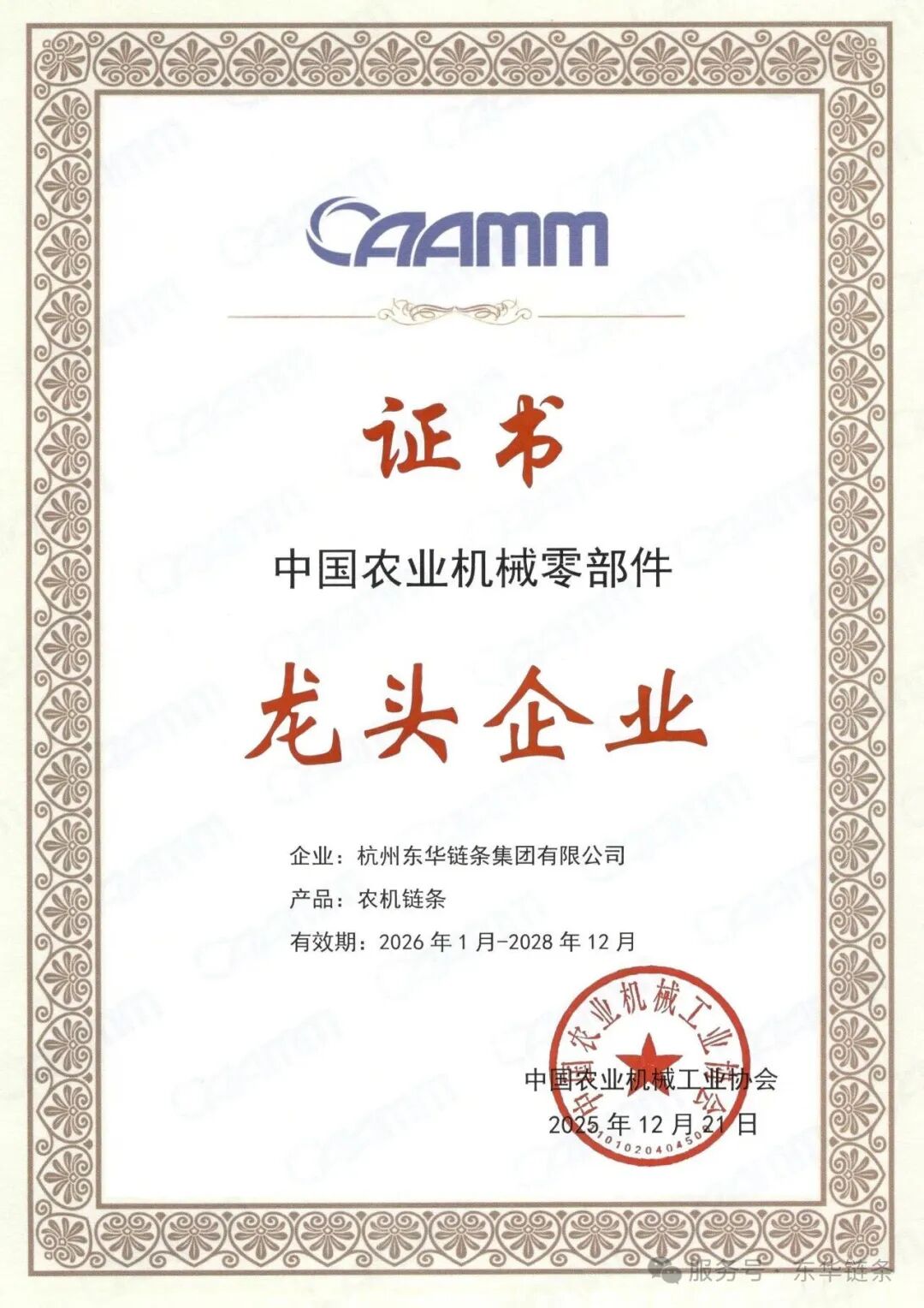 近日,在2025年全國農(nóng)機(jī)工業(yè)工作會(huì)議暨中國農(nóng)業(yè)機(jī)械工業(yè)協(xié)會(huì)七屆二次理事會(huì)上,東華鏈條集團(tuán)憑借在農(nóng)機(jī)鏈傳動(dòng)領(lǐng)域的技術(shù)積淀、產(chǎn)品可靠性與市場服務(wù)等方面的綜合實(shí)力,再次獲評(píng) “中國農(nóng)業(yè)機(jī)械零部件龍頭企業(yè)” 稱號(hào),有效期三年。