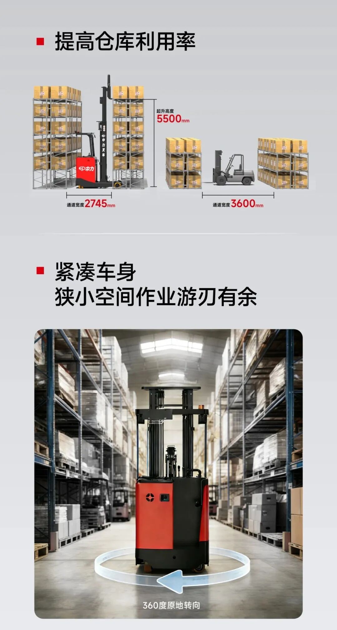 高空間適應(yīng)性:前移式緊湊機(jī)身,直角堆垛通道寬度<3米,可直接適配原人工叉車通道。