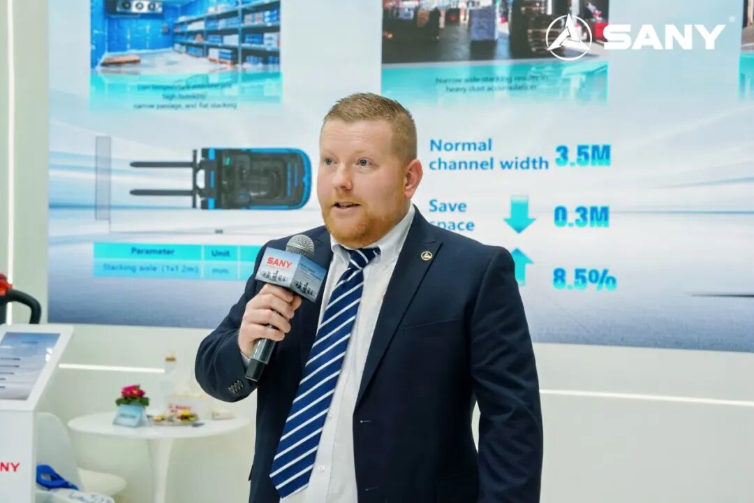 三一機器人歐洲高級營銷經(jīng)理Michael現(xiàn)場做產(chǎn)品推薦。三一三支點叉車被譽為“窄通道精靈”與“冷庫搬運專家”。憑借優(yōu)異的性能、領(lǐng)先同級的智能安全技術(shù),贏得了眾多客戶的關(guān)注。