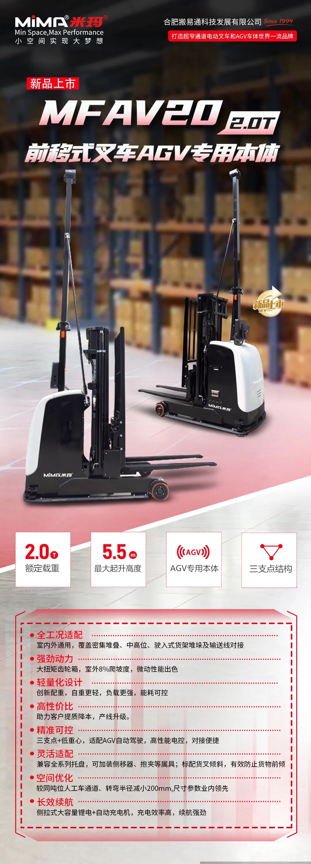 重磅新品來襲,賦能智能倉儲升級!全新前移式叉車AGV專用本體MFAV20震撼上市,以“輕型三支點”為核心設計,聚焦輕量化、高性價比兩大核心優(yōu)勢,兼顧強勁性能與靈活適配,輕松破解室內(nèi)外復雜堆垛難題,助力企業(yè)提質(zhì)降本、實現(xiàn)產(chǎn)線智能化升級!