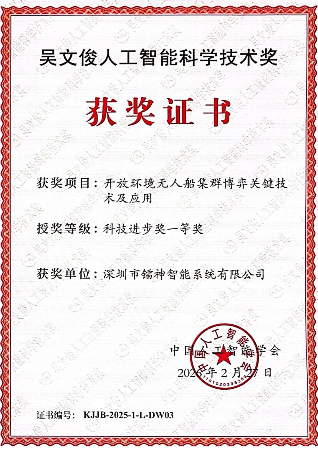 熱烈祝賀!深圳市鐳神智能系統(tǒng)有限公司憑借「開放環(huán)境無人船集群博弈關(guān)鍵技術(shù)及應(yīng)用」項目,榮獲2025 年度吳文俊人工智能科技進步獎一等獎!