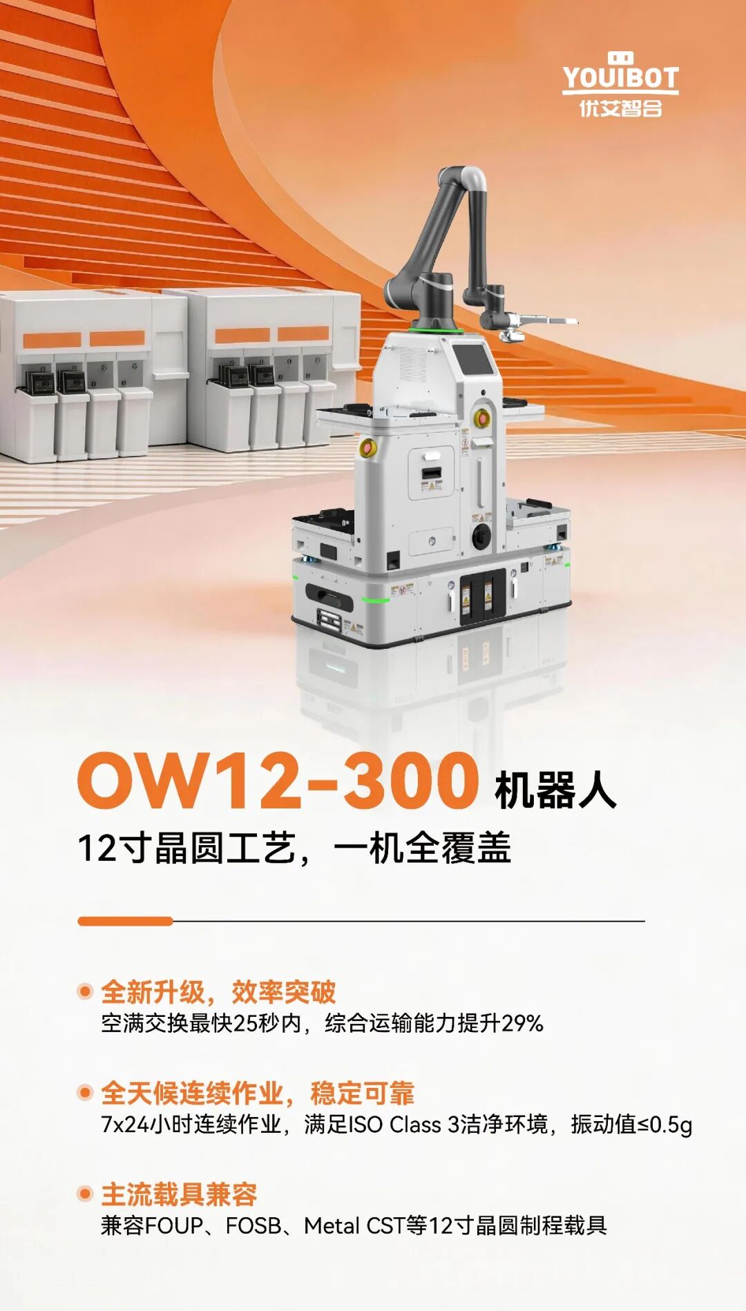 憑借高精度、高效率、高可靠性、低振動(dòng)及高潔凈度的性能,OW12-300作為專為12寸晶圓全工藝段設(shè)計(jì)的移動(dòng)操作機(jī)器人,兼容FOUP、FOSB、Metal CST等12寸晶圓制程載具。
