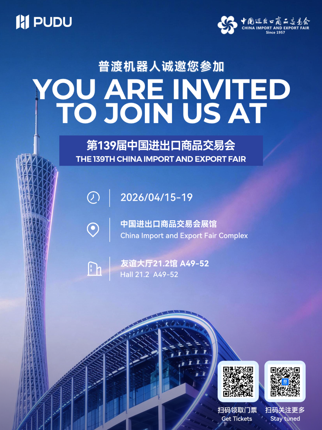 時(shí)間:2026年4月15-19日地點(diǎn):廣州·中國進(jìn)出口商品交易會(huì)展館展位:友誼大廳21.2館 A49-52從配送到清潔,從工業(yè)到具身智能,普渡機(jī)器人以領(lǐng)先的商用服務(wù)機(jī)器人解決方案,服務(wù)全球80多個(gè)國家和地區(qū)。本屆廣交會(huì),我們將展出最新服務(wù)機(jī)器人矩陣,現(xiàn)場(chǎng)體驗(yàn)高效、穩(wěn)定、智能的自動(dòng)化服務(wù)能力。