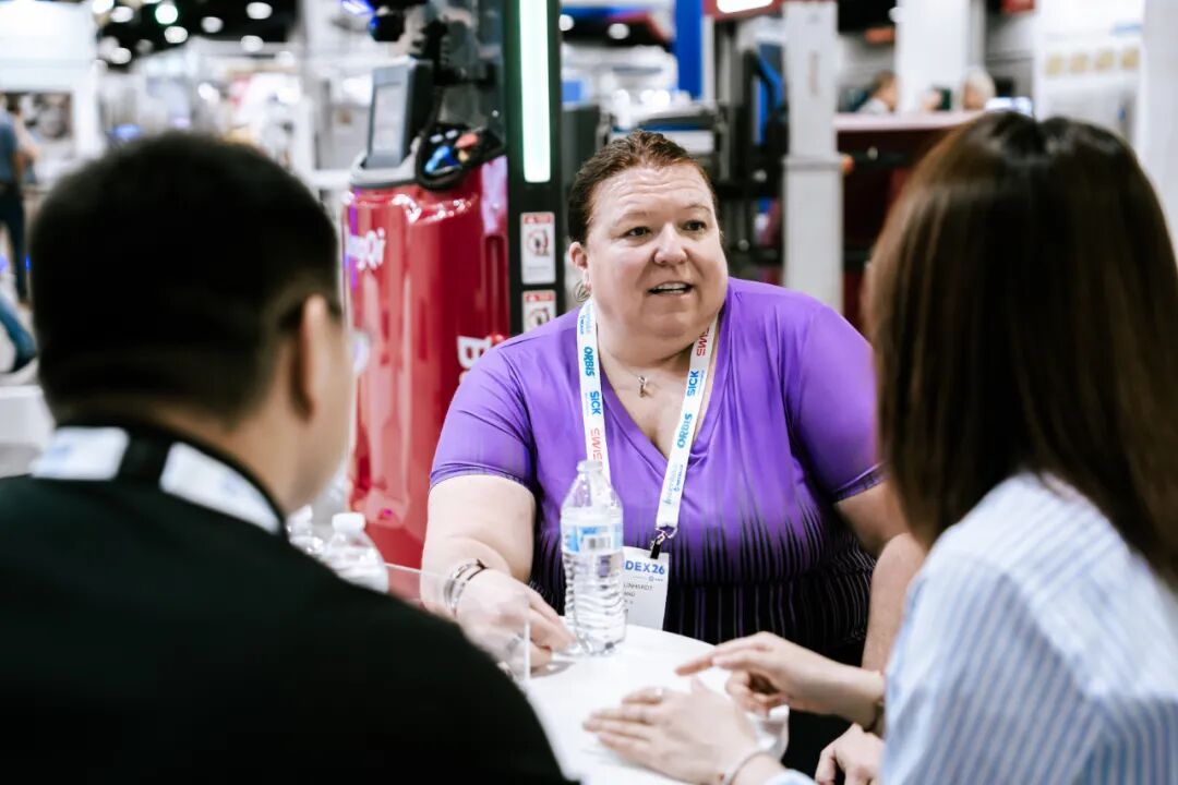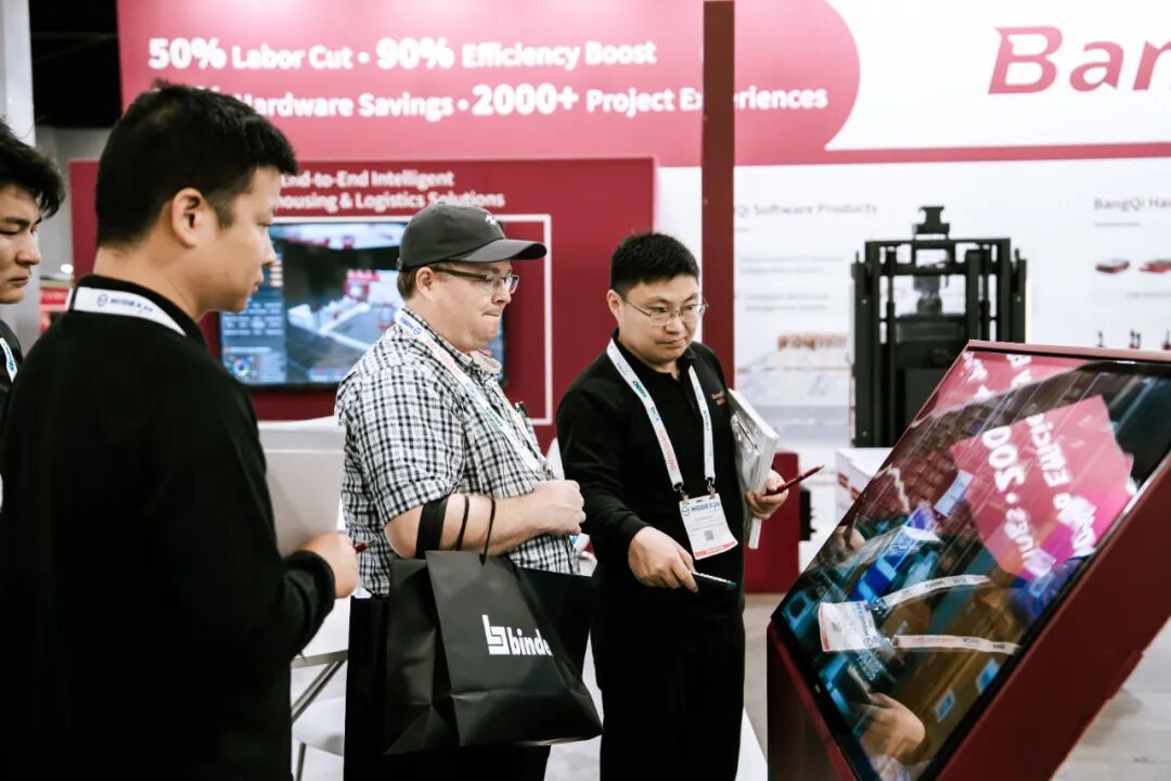 展會(huì)現(xiàn)場(chǎng),磅旗特設(shè)案例診斷專區(qū),幾組技術(shù)專家正在與來訪客戶交流。依托2000+全球項(xiàng)目經(jīng)驗(yàn)與近百家頭部客戶成功案例,磅旗專家為到訪客戶提供了一對(duì)一倉(cāng)儲(chǔ)診斷、動(dòng)線優(yōu)化、設(shè)備選型與部署規(guī)劃等服務(wù),精準(zhǔn)匹配客戶實(shí)際需求,獲得海外客戶的高度認(rèn)可。