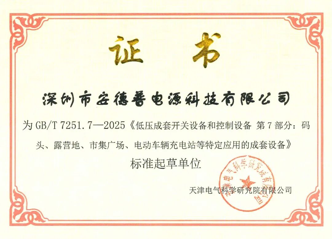 本次安德普作為主要起草單位參與制定的國家標準為 GB/T 7251.7-2025/IEC 61439-7:2022《低壓成套開關(guān)設(shè)備和控制設(shè)備 第7部分:碼頭、露營地、市集廣場、電動車輛充電站等特定應用的成套設(shè)備》。該標準于2025年8月1日發(fā)布,2026年2月1日實施,為包括電動車輛充電站在內(nèi)的特定應用場景的低壓成套設(shè)備,提供了全面的安全、結(jié)構(gòu)與性能要求。