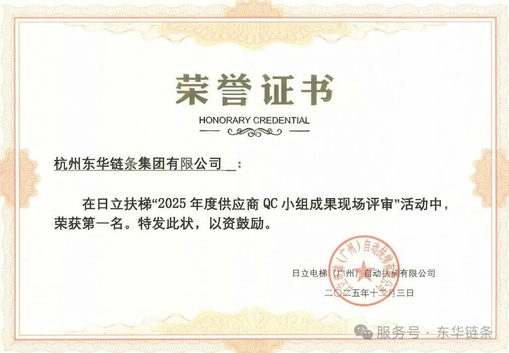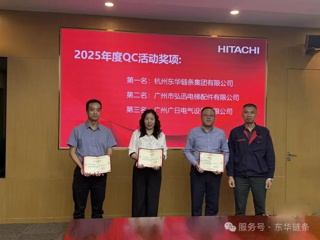 4月17日,日立電梯(廣州)自動(dòng)扶梯有限公司召開年度供應(yīng)商大會(huì)。東華鏈條憑借其在產(chǎn)品質(zhì)量、交付服務(wù)及技術(shù)創(chuàng)新方面的綜合表現(xiàn),榮獲日立電梯“2025年度優(yōu)秀供應(yīng)商”獎(jiǎng)。與此同時(shí),在備受關(guān)注的“日立扶梯QC小組成果現(xiàn)場(chǎng)評(píng)審”中,東華鏈條從眾多參評(píng)單位中脫穎而出,獲得第一名。東華鏈條扶梯工程鏈?zhǔn)聵I(yè)部總經(jīng)理汪希代表東華上臺(tái)領(lǐng)獎(jiǎng)。
