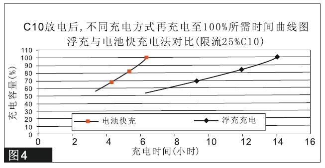 實(shí)際使用中,隨著溫度增高,浮充電壓的溫度補(bǔ)償減小了充電電流,部分抵消了高溫的不良影響。