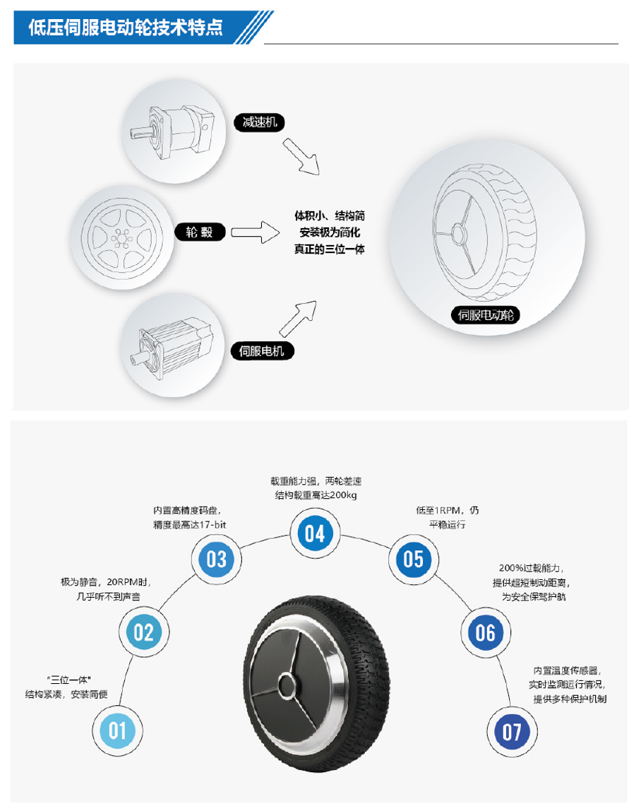 電機(jī)及外輪設(shè)計(jì)一體化的伺服電動(dòng)輪,是低壓伺服電機(jī)的完美變形,具有伺服電機(jī)高精度的優(yōu)良特性,不需要減速箱,安裝極其方便。與電動(dòng)輪設(shè)計(jì)相匹配的DS系列驅(qū)動(dòng)器,可以同時(shí)實(shí)現(xiàn)兩輪之間精確運(yùn)行及無差配合,并且支持多種控制方式。