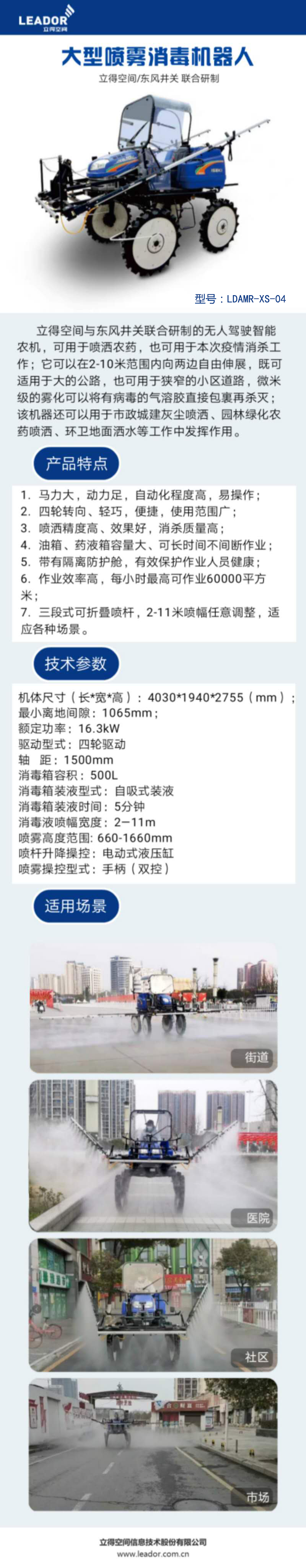 立得與東風(fēng)井關(guān)廠聯(lián)合研制了無(wú)人駕駛智能農(nóng)機(jī),本來(lái)用于噴灑農(nóng)藥,不料這次防疫派了大用場(chǎng)。由于它可以在2-10米范圍內(nèi)向兩邊自由伸展,所以既可適用于大馬路,又可用于狹窄的小區(qū)道路。更厲害的是微米級(jí)的霧化效果可以將有病毒的氣溶膠直接包裏再殺滅。最重要的是價(jià)格不貴,操作簡(jiǎn)便。希望這一"黑科技"可以發(fā)揮更大的作用,早點(diǎn)把"新冠"消滅干凈!