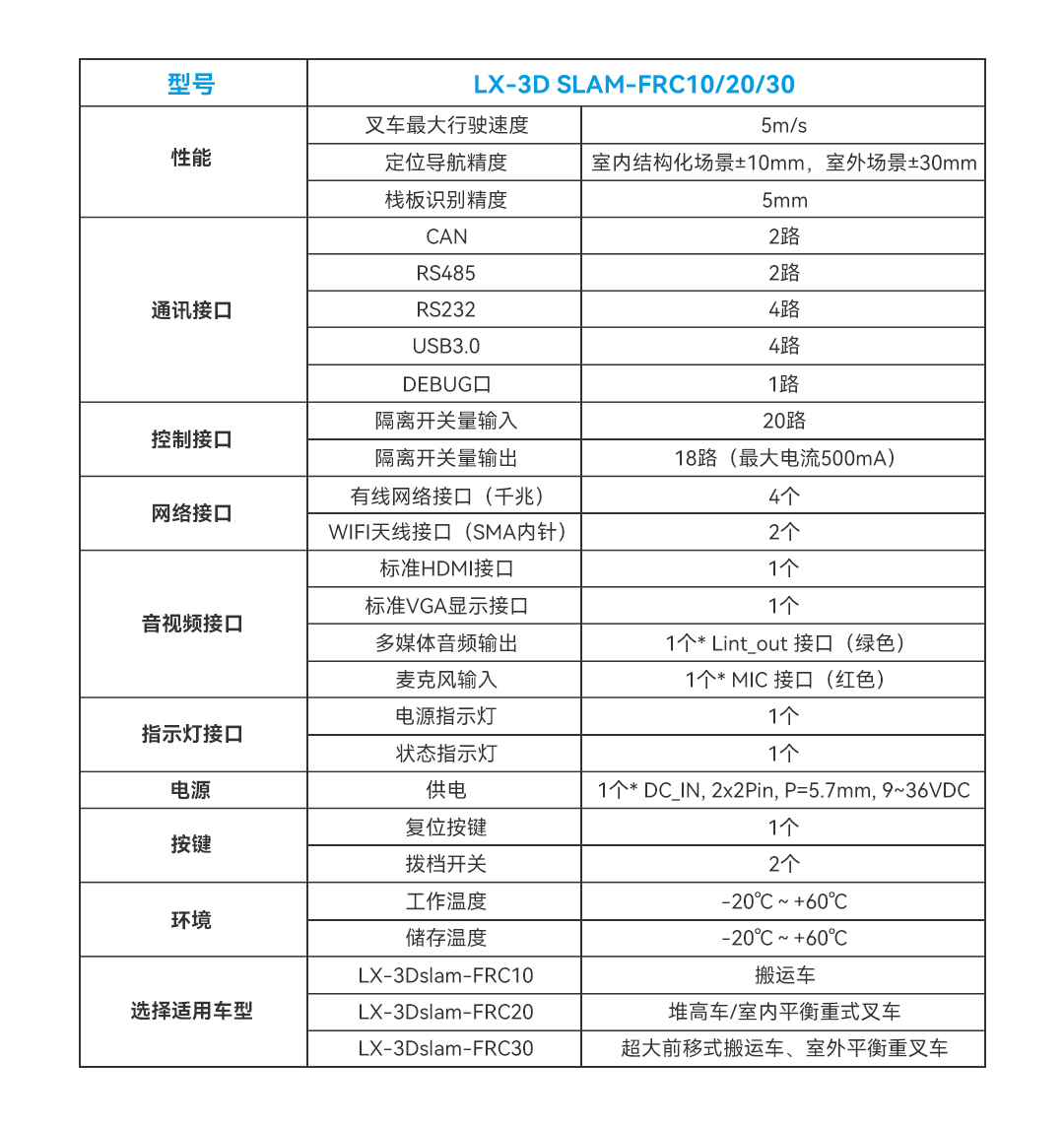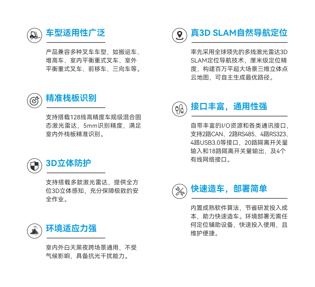 集成了3D SLAM激光導(dǎo)航算法、運動控制算法、棧板識別算法及3D防護(hù)算法,適用于多種叉車底盤,可以實現(xiàn)三維建圖、定位導(dǎo)航、路徑規(guī)劃、安全避障、3D立體防護(hù)、棧板識別、自動充電等功能,快速輕松完成叉車無人化改造。