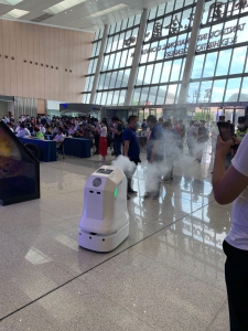 消毒機(jī)器人是華南智能機(jī)器人創(chuàng)新研究院自主研發(fā)的一款服務(wù)型消毒機(jī)器人,它采用自然導(dǎo)航技術(shù),實現(xiàn)自主定位,自動避障。消毒水用量為0.5~2升/小時??蓮V泛應(yīng)用醫(yī)療衛(wèi)生機(jī)構(gòu)、各類公共場所,食品加工、工廠廠區(qū)、科技館、博物館、政務(wù)大廳、展館展廳等多種場合。